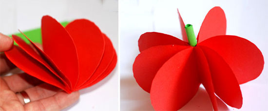 3. با مقوای سبز، یک لوله باریک درست کنید و آنرا در فضای خالی بین کاغذهای قرمز که از قبل چسبانده بودید، قرار دهید.