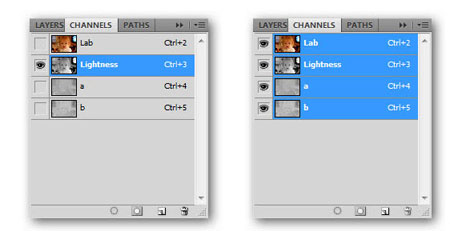 توجه داشته باشید که تغییر رنگ تصویر از RGB به CMYK باعث خواهد شد تا رنگهای شما در نهایت تغییر کنند. در گام بعدی به پنل Channel بروید. اگر این پنل را در کنار پنل layers مشاهده نمیکنید سعی کنید آن را از مسیر Window > Channels فعال نمایید. حالا باید در این پنل بر روی Lightness کلیک نمایید. مشاهده خواهید کرد که تصاویر شما سیاه و سفید شده است.