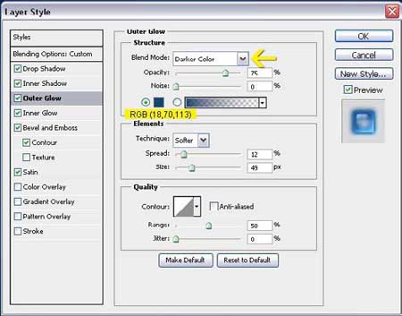 تنظیمات Outer Glow. مود را در حالت Darker Color قرار داده تا یک ترکیب رنگ تیره تر ایجاد شود.