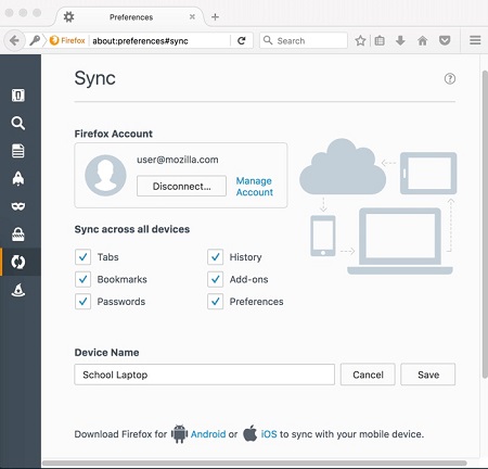 برای همگام سازی داده های مرور گر شما از Firefox Sync استفاده می شود. این مورد که قبلا یک ادیشن مرور گر جداگانه بوده اکنون در فایر فاکس یکپارچه شده است.