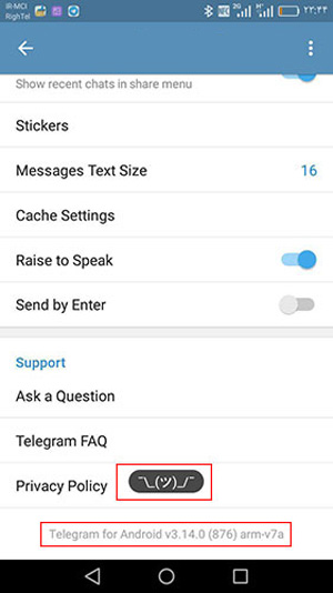 به انتهای صفحهی Settings بروید. انگشت خود را بر روی عبارت Telegram for Android قرار داده و چند لحظه نگه دارید. خواهید دید که شکلکی نمایان میشود.