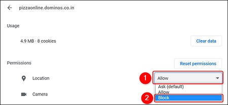 برای جلوگیری از دسترسی یک سایت به مکان شما روی آن سایت در این لیست کلیک کنید. در صفحه زیر در کنار Location روی منوی کشویی Allow کلیک کرده و Block را انتخاب کنید.