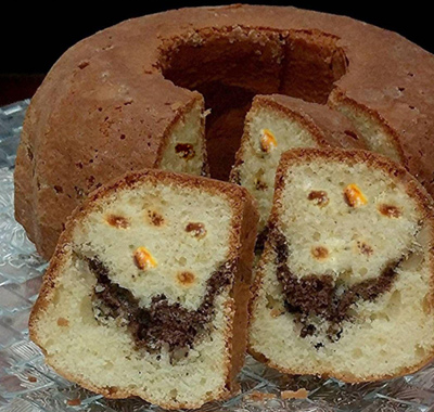 یکی دو قاشق از مایه را کاکائو اضافه می کنیم. روی مایه ساده مایع کاکائویی را می ریزیم و گردو و کشمش یا خلال بادام بوداده شده می پاشیم و بعد بقیه مایع سفید را روی آن می ریزیم و روی کیک گردو و کشمش می پاشیم (کشمشی که خیسانده و در پارچه خشک کرده و در آرد غلتانده شده و بعد الک کرده که سنگین نشه که بره ته کیک) و داخل فر با حرارت ١٨٠ درجه حدود ٤٠ دقيقه گذاشتم.