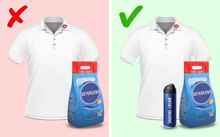 بعضی اوقات خلاص شدن از شر لکه های آرایش غیرممکن است زیرا برخی پایه ها و برخی از انواع رژ لب می توانند برای همیشه روی لباس شما باقی بمانند. با این حال، برای از بین بردن آرایش، می توانید مقداری کرم اصلاح (خمیر ریش) را به طور مرتب بر روی لکه قرار دهید و لباس ها را طبق معمول بشویید.