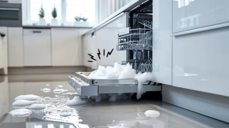 استفاده از مایع ظرفشویی معمولی بهجای شوینده مخصوص ماشین ظرفشویی میتواند باعث تولید کف بیشازحد شود. این کف اضافی از درب نشت کرده و نشتی ایجاد میکند.