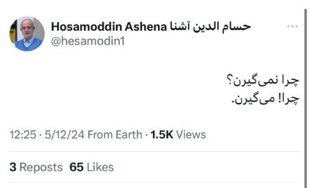 حسامالدین آشنا، مشاور حسن روحانی در دولت دوازدهم در شبکه اجتماعی ایکس نوشت: «چرا نمیگیرن؟ چرا! میگیرن.»
