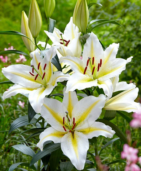 گونه Oriental hybrids: گونه Oriental hybrids دارای گل های بزرگ و خوش عطری است . بازه ی رنگی این نمونه از رنگ سفید خالص تا رنگ ارغوانی تیره طول دارد . این گل ها برای رشد به یک مکان که نیمه سایه باشد نیاز دارند.